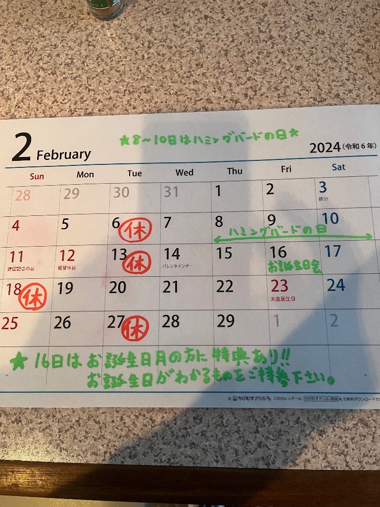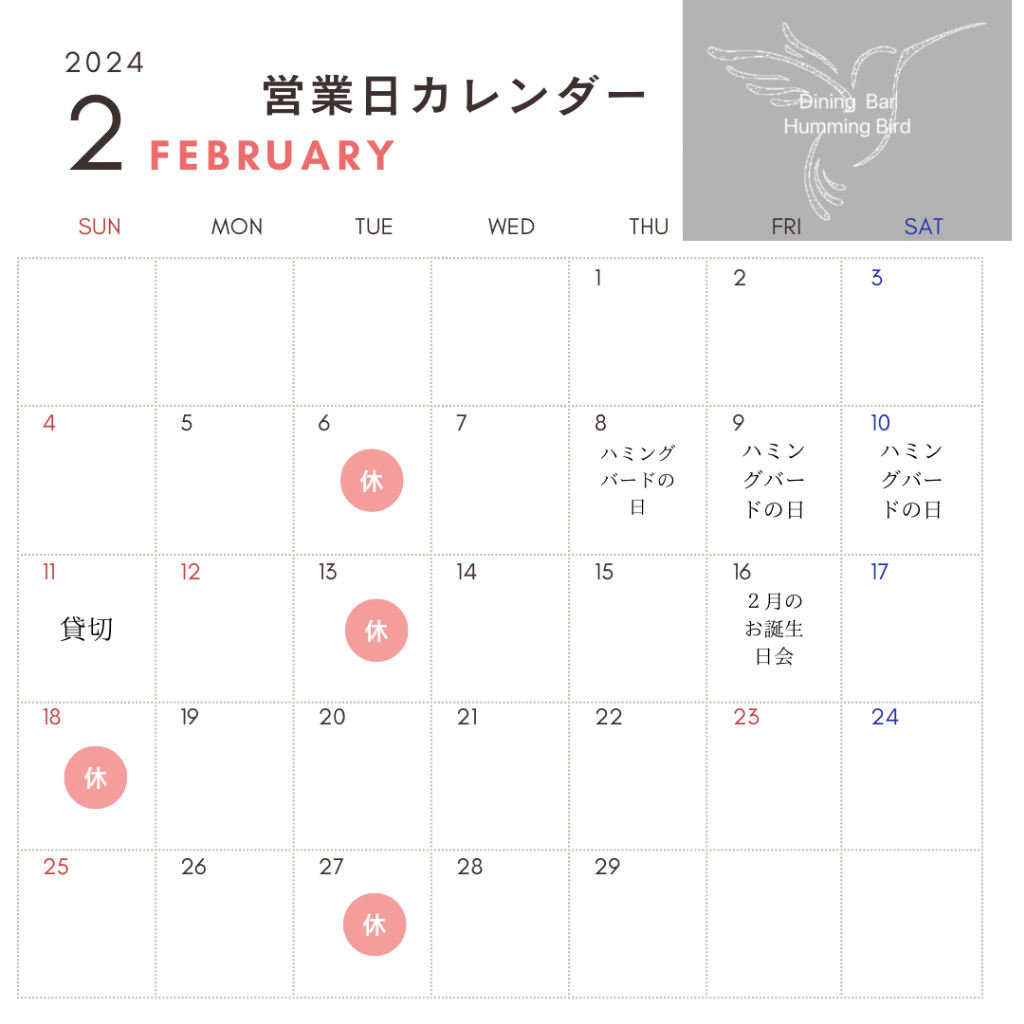 2月の営業日ですが貸切予約が入りましたので11日は貸切になります。
